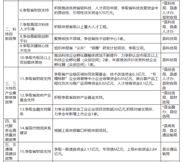 上述8個領(lǐng)域政策縣財政2023年預(yù)算安排資金,除交叉重疊部分外,支持總額約50億元。各領(lǐng)域政策縣級牽頭單位要根據(jù)文件要求,會同財政金融、自然資源、能源、人才等要素保障單位,抓緊出臺配套政策文件,及時做好政策的宣傳解讀、責(zé)任分解和落地實施,推動政策精準滴灌、直達快享,確?;鶎佑懈?、群眾獲益、企業(yè)得利。