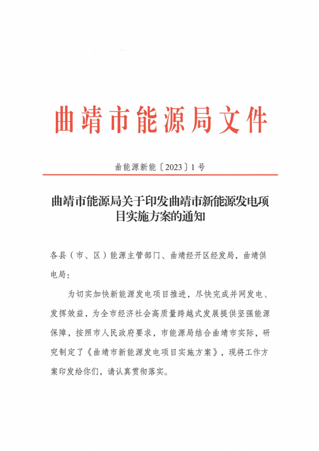 2月8日,曲靖市能源局關(guān)于印發(fā)曲靖市新能源發(fā)電項目實施方案的通知。通知顯示,為切實加快新能源發(fā)電項目推進(jìn),盡快完成并網(wǎng)發(fā)電、發(fā)揮效益,曲靖市全力推進(jìn)全市總裝機(jī)976.1萬千瓦、總投資523.53億元的75個在建風(fēng)電、光伏項目建設(shè),確保2023年完成并網(wǎng)350萬千瓦,完成投資100億元。