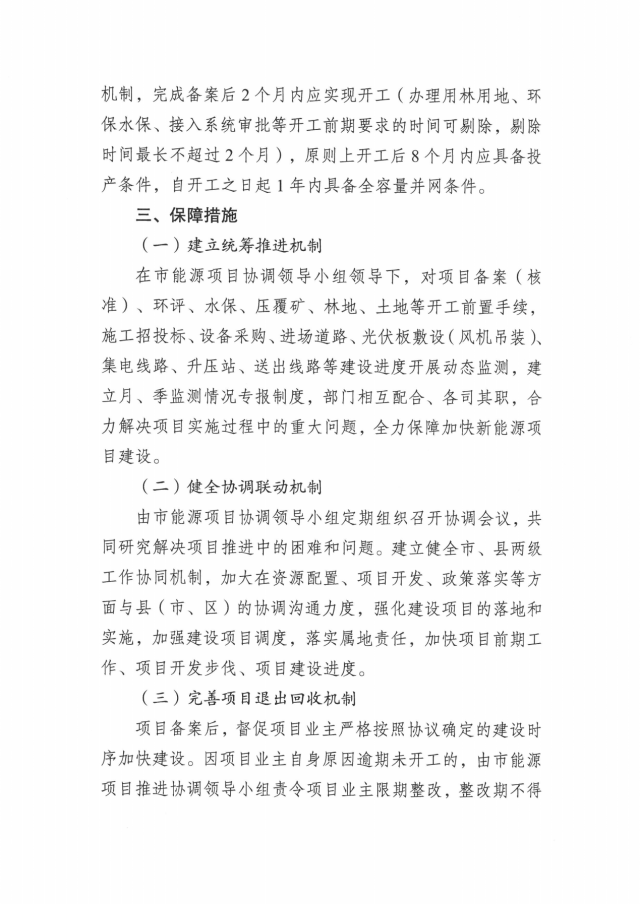 按照相關(guān)文件要求,科學(xué)的市場化原則擇優(yōu)項目業(yè)主,簽訂項目投資開發(fā)協(xié)議時,明確開工時限、投產(chǎn)時限和收回機(jī)制,完成備案后2個月內(nèi)應(yīng)實現(xiàn)開工(辦理用林用地、環(huán) 保水保、接入系統(tǒng)審批等開工前期要求的時間可剔除,剔除 時間最長不超過2個月),原則上開工后8個月內(nèi)應(yīng)具備投產(chǎn)條件,自開工之日起1年內(nèi)具備全容量并網(wǎng)條件。