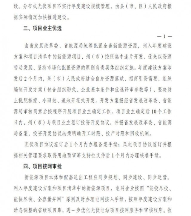 根據(jù)文件,年度方案的制定由省能源局會同各州、市根據(jù)項目成熟度和接網(wǎng)條件,對省級項目庫的項目進行建設(shè)時序排序。年度建設(shè)方案印發(fā)后 2個月內(nèi),州(市)人民政府結(jié)合自身資源稟賦、招商引資需要,組織編制開發(fā)方案(包含組織形式、企業(yè)基本條件和優(yōu)選評審參數(shù)等),堅決防止挑肥揀瘦、小而散、遍地開花式開發(fā)。
