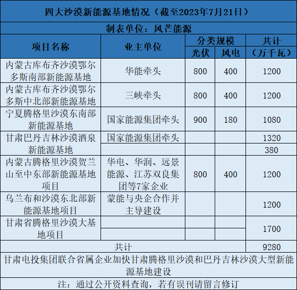 根據(jù)公開信息不完全梳理,截至目前,在四大沙漠已明確93GW風光大基地項目。