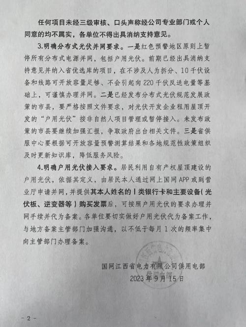 據(jù)網(wǎng)絡(luò)媒體消息:近日,國網(wǎng)江西省下發(fā)《關(guān)于進(jìn)一步明確分布式光伏消納和并網(wǎng)服務(wù)有關(guān)事項的通知》,明確要求紅色預(yù)警地區(qū)暫停戶用光伏并網(wǎng),對光伏開發(fā)企業(yè)租用屋頂開發(fā)的“戶用光伏”按非自然人項目管理或暫停接入,加強(qiáng)出具“消納意見”的管理,任何項目未經(jīng)三級審核均不得出具消納意見。