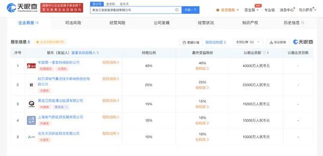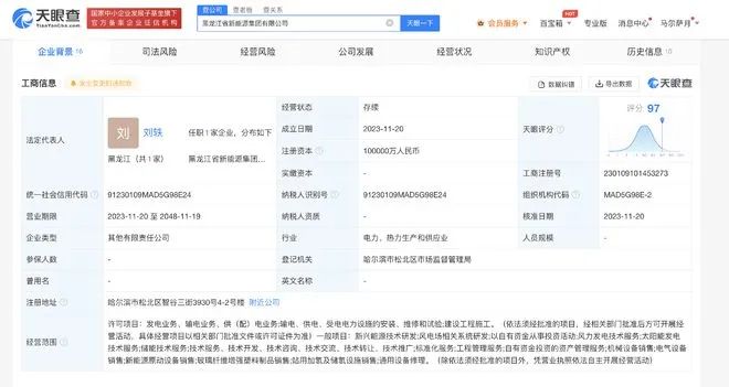 天眼查App顯示,11月20日,黑龍江省新能源集團(tuán)有限公司成立,法定代表人為劉軼,注冊(cè)資本10億人民幣,經(jīng)營(yíng)范圍含新興能源技術(shù)研發(fā)、風(fēng)電場(chǎng)相關(guān)系統(tǒng)研發(fā)、以自有資金從事投資活動(dòng)、風(fēng)力發(fā)電技術(shù)服務(wù)、太陽(yáng)能發(fā)電技術(shù)服務(wù)、儲(chǔ)能技術(shù)服務(wù)、工程管理服務(wù)等。股東信息顯示,該公司由中國(guó)一重(601106)、佳電股份(000922)、黑龍江辰能清潔能源有限公司、上海電氣新能源發(fā)展有限公司、北京天潤(rùn)新能投資有限公司共同持股。