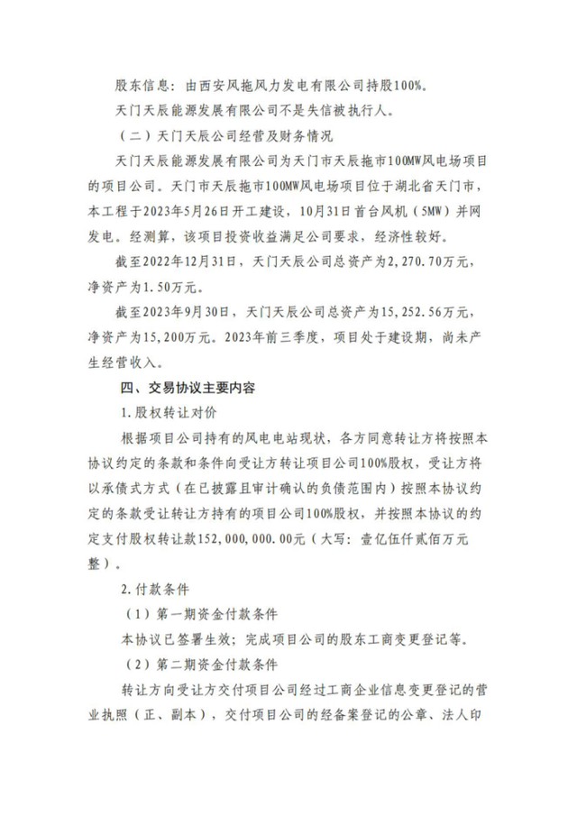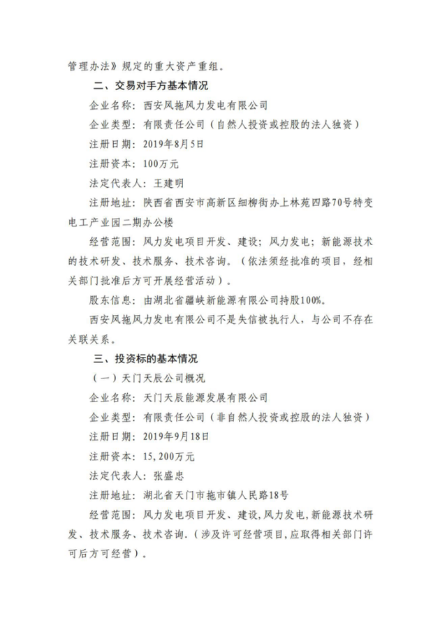 以股權(quán)對(duì)價(jià)不超過(guò)15,200萬(wàn)元收購(gòu)天門(mén)天辰能源發(fā)展有限公司100%股權(quán),承接其全部資產(chǎn)及經(jīng)審計(jì)確認(rèn)的負(fù)債,總投資不超過(guò)73,852萬(wàn)元。天門(mén)天辰公司為天門(mén)市天辰拖市100MW風(fēng)電場(chǎng)項(xiàng)目公司。
