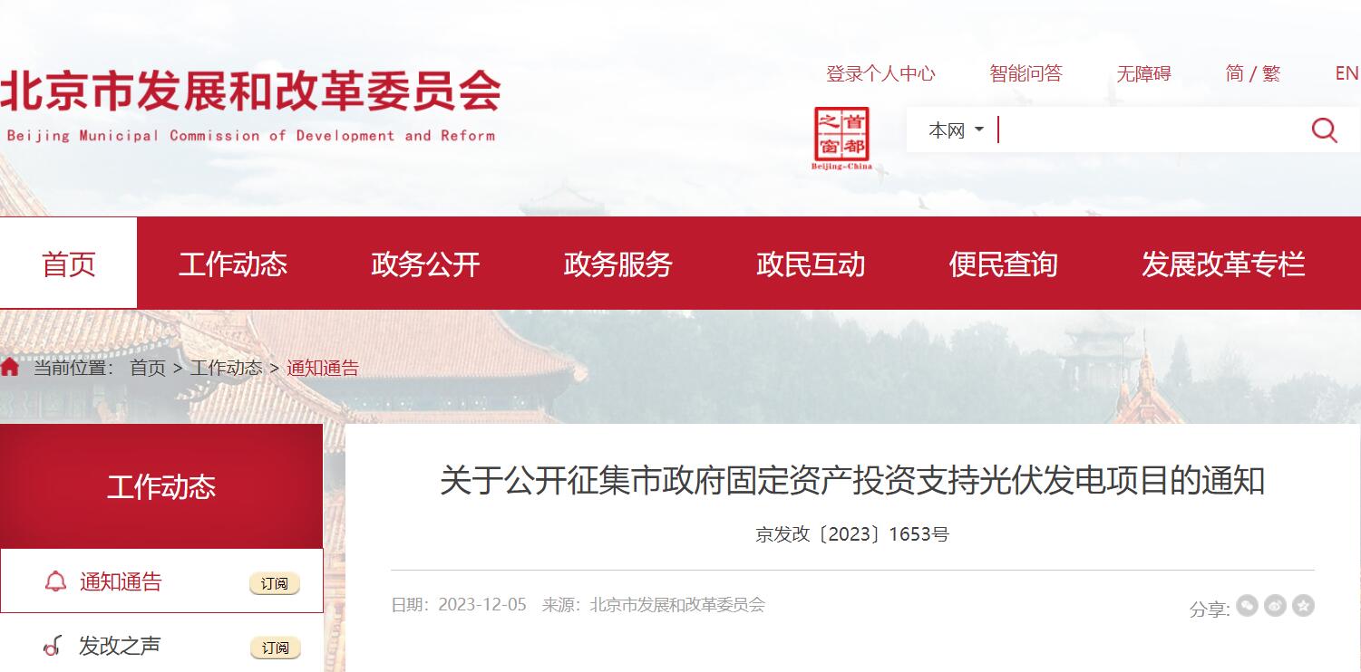 北京市發(fā)展和改革委員會關于公開征集市政府固定資產投資支持光伏發(fā)電項目的通知
