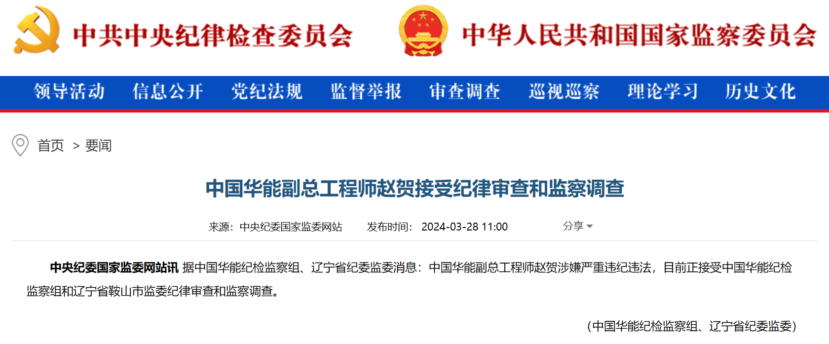 3月28日,中央紀(jì)委國(guó)家監(jiān)委網(wǎng)站訊 據(jù)中國(guó)華能紀(jì)檢監(jiān)察組、遼寧省紀(jì)委監(jiān)委消息:中國(guó)華能副總工程師趙賀涉嫌嚴(yán)重違紀(jì)違法,目前正接受中國(guó)華能紀(jì)檢監(jiān)察組和遼寧省鞍山市監(jiān)委紀(jì)律審查和監(jiān)察調(diào)查。