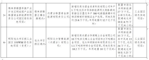 (四)明陽包頭市石拐工業(yè)園區(qū)350WM綠色供電項(xiàng)目。此本項(xiàng)目為變更項(xiàng)目,新增負(fù)荷內(nèi)蒙古華商稀土合金有限公司10萬噸多元稀土合金項(xiàng)目和2萬噸硼合金項(xiàng)目、包頭和順新材料有限責(zé)任公司1.1萬噸特種特合金項(xiàng)目等,用電負(fù)荷為18.2萬千瓦,年用電量10億千瓦時。配置市場化并網(wǎng)新能源35萬千瓦,其中風(fēng)電15萬千瓦、光伏20萬千瓦,配建電化學(xué)儲能5.25萬千瓦/4小時。