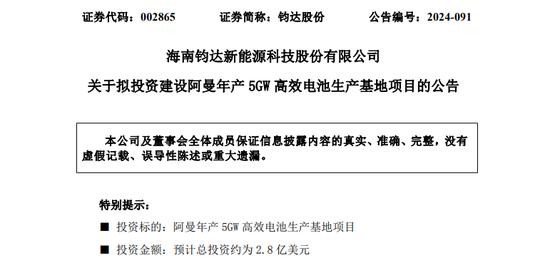 7月25日晚間,鈞達股份公告稱,公司擬于阿曼蘇丹國(下稱“阿曼”)投資建設(shè)5GW高效電池生產(chǎn)基地,該項目預計投資總額2.8億美元,項目建設(shè)周期約9個月,預計2025年建成投產(chǎn)。