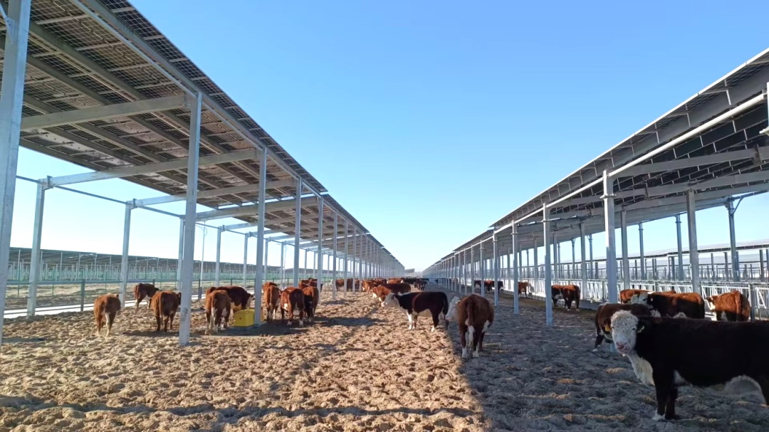 項目分三期建設(shè),一期占地9380畝,建設(shè)內(nèi)容包括育肥牛欄、動物保健中心、全混合日糧中心、升壓站及送出線路等設(shè)施。其中,育肥牛欄建設(shè)面積達150萬平方米,建成后,養(yǎng)殖規(guī)模可達存欄肉牛10萬頭、年出欄肉牛20萬頭,將成為亞洲最大的牧光融合產(chǎn)業(yè)集群。超級牧場內(nèi)育肥牛舍屋頂光伏及草光互補區(qū)地面光伏兩部分組成,光伏總裝機容量398兆瓦。