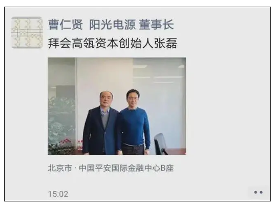 值得一提的是,在陽(yáng)光電源發(fā)布定增預(yù)案之前的1月26日,陽(yáng)光電源董事長(zhǎng)曹仁賢的朋友圈里就發(fā)布了一張與張磊的合照,并配文“拜會(huì)高瓴資本創(chuàng)始人高磊”。這不僅引人遐想,高瓴會(huì)像入股隆基一樣,入股陽(yáng)光電源么??