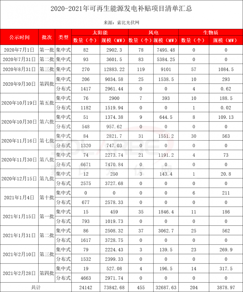 據(jù)索比光伏網(wǎng)統(tǒng)計(jì),2020年至今,國(guó)家電網(wǎng)共公布十四批可再生能源補(bǔ)貼清單。其中,太陽能發(fā)電項(xiàng)目24142個(gè),容量73.84GW;風(fēng)電項(xiàng)目455個(gè),容量32.69GW;生物質(zhì)發(fā)電項(xiàng)目204個(gè),容量3.88GW。