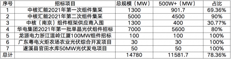 近日以來,以中核、華電為代表的央國企已經(jīng)開啟或完成2021年第一批次的光伏組件設(shè)備招標(biāo)工作,根據(jù)招標(biāo)要求發(fā)現(xiàn),大尺寸組件的需求已進入白熱化階段。