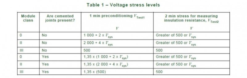 2. 絕緣測試 (MQT 03)依據(jù)組件的防護等級區(qū)分絕緣測試試加電壓等級,參考以下表格: