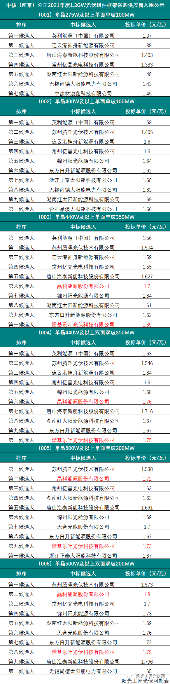 根據(jù)陽光工匠光伏網(wǎng)的統(tǒng)計(jì),中核(南京)1.3GW組件集采的開標(biāo)結(jié)果如下表所示。