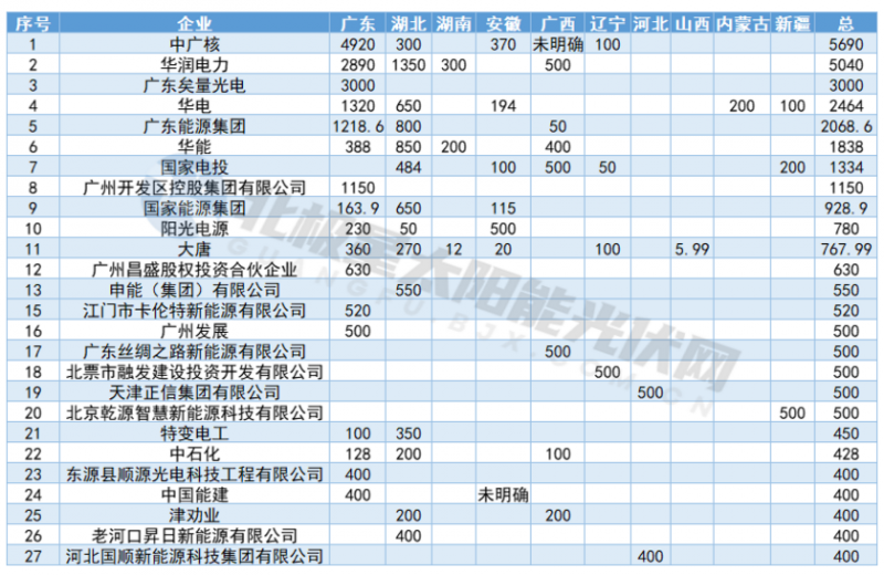 領(lǐng)跑者仍就是央企。中廣核僅在廣東一地已狂攔9個(gè)項(xiàng)目規(guī)模達(dá)4.9GW,疊加湖北、安徽、遼寧、廣西項(xiàng)目,備案總規(guī)模接近5.7GW。同為“四小豪門”的華潤電力同樣狂飆,廣東2.89GW、湖北1.35GW、廣西500MW、湖南300MW,儲備規(guī)模直達(dá)5GW。此外,華電、華能、國家電投等五大電力央企的備案規(guī)模均達(dá)到GW級以上。