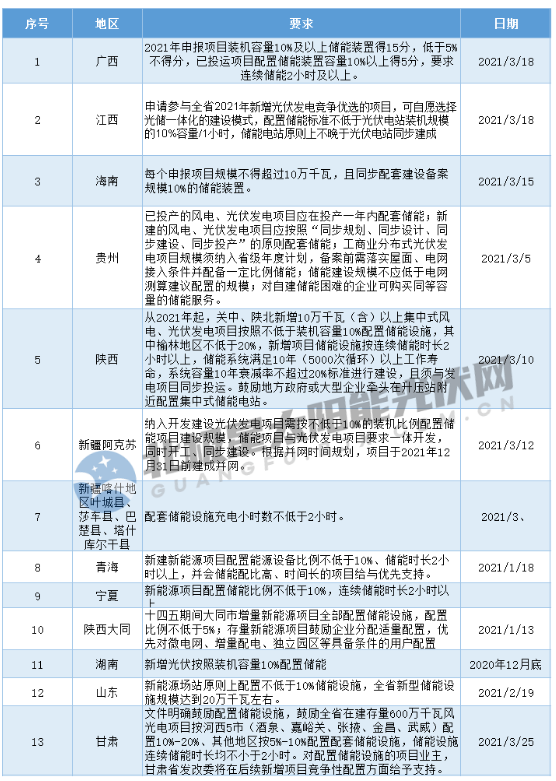 就消納掣肘,光伏電站配置儲能成為政策導(dǎo)向。據(jù)北極星太陽能光伏網(wǎng)統(tǒng)計(jì),2021開年以來,廣西、江西、貴州、山東、海南等13個(gè)地區(qū)要求風(fēng)、光項(xiàng)目強(qiáng)配儲能,比例在5%~10%之間,連續(xù)儲能在2小時(shí)及以上。然而在儲能經(jīng)濟(jì)性仍未達(dá)到預(yù)期且獲利商業(yè)模式仍未明朗下,強(qiáng)配儲能對于光伏電站投資業(yè)主來說無疑是雪上加霜。