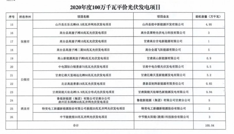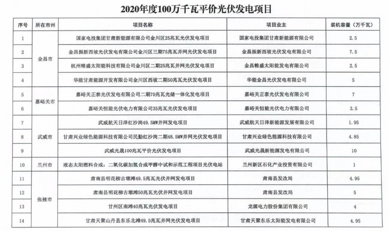 3月25日,甘肅省發(fā)改委發(fā)布《關(guān)于加快推進(jìn)全省新能源存量項(xiàng)目建設(shè)工作》的通知。文件明確,甘肅省目前新能源存量項(xiàng)目約600萬千瓦。其中,光伏發(fā)電項(xiàng)目1.23GW包括:酒湖直流工程配套23.5萬千瓦光伏發(fā)電項(xiàng)目以及《國家發(fā)展改革委辦公廳國家能源局綜合司關(guān)于公布2020年風(fēng)電、光伏發(fā)電平價(jià)上網(wǎng)項(xiàng)目的通知》(發(fā)改辦能源〔2020〕588號)中尚未并網(wǎng)100萬千瓦光伏發(fā)電項(xiàng)目。