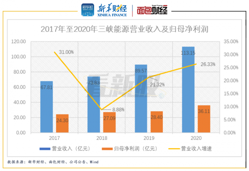 三峽能源主營業(yè)務(wù)為風能、太陽能的開發(fā)、投資和運營。2018年至2020年,公司實現(xiàn)營業(yè)收入分別為73.83億元、89.57億元、113.15億元,同比分別增加8.88%、21.32%、26.33%;實現(xiàn)歸母凈利潤分別為27.09億元、28.40億元、36.11億元,同比分別增加11.48%、4.84%、27.16%。