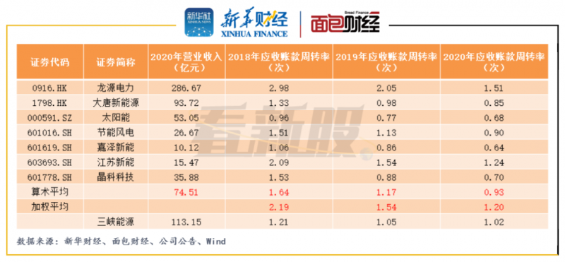 可以看出,2020年三峽能源的應(yīng)收賬款周轉(zhuǎn)率為1.02次,略高于可比公司平均水平,但是低于可比公司以當期營業(yè)收入加權(quán)后的平均值,與龍源電力、江蘇新能應(yīng)收賬款周轉(zhuǎn)水平仍有較大差距,日后賒銷回款效率有待觀察。