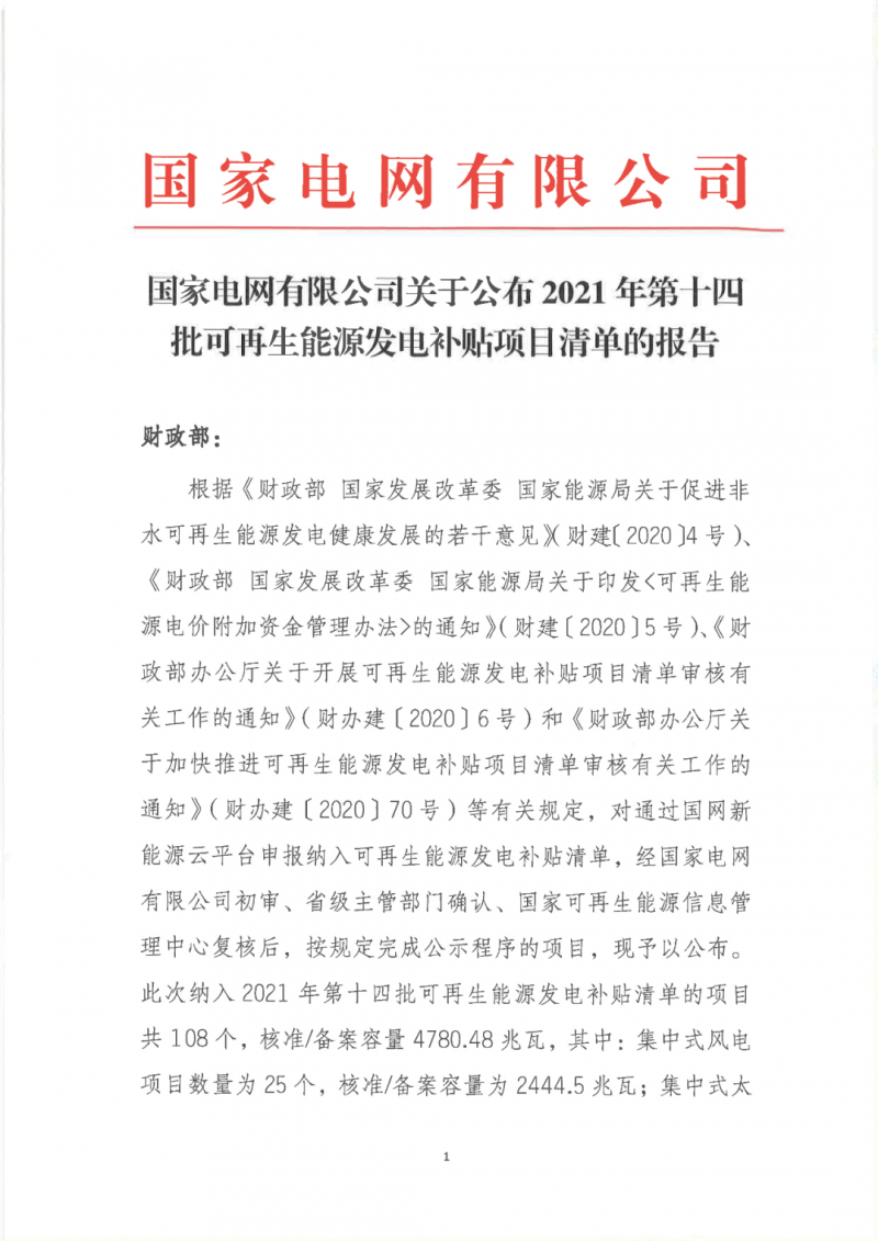 2021年7月31日,我公司已將完成公示的2021年第十四批可再生能源發(fā)電項目補貼項目清單上報國家主管部門,第十四批項目清單及后續(xù)項目審核進展情況,請登錄新能源云平臺查詢。