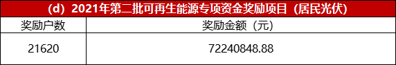 而2021年第二批光伏專項(xiàng)資金獎(jiǎng)勵(lì)項(xiàng)目共計(jì)22894個(gè),獎(jiǎng)勵(lì)金額2.68億。其中光伏電站項(xiàng)目13個(gè),獎(jiǎng)勵(lì)金額3531千萬(wàn);企業(yè)光伏項(xiàng)目1261個(gè),獎(jiǎng)勵(lì)金額1.605億;居民光伏21620戶,獎(jiǎng)勵(lì)金額7224千萬(wàn)。