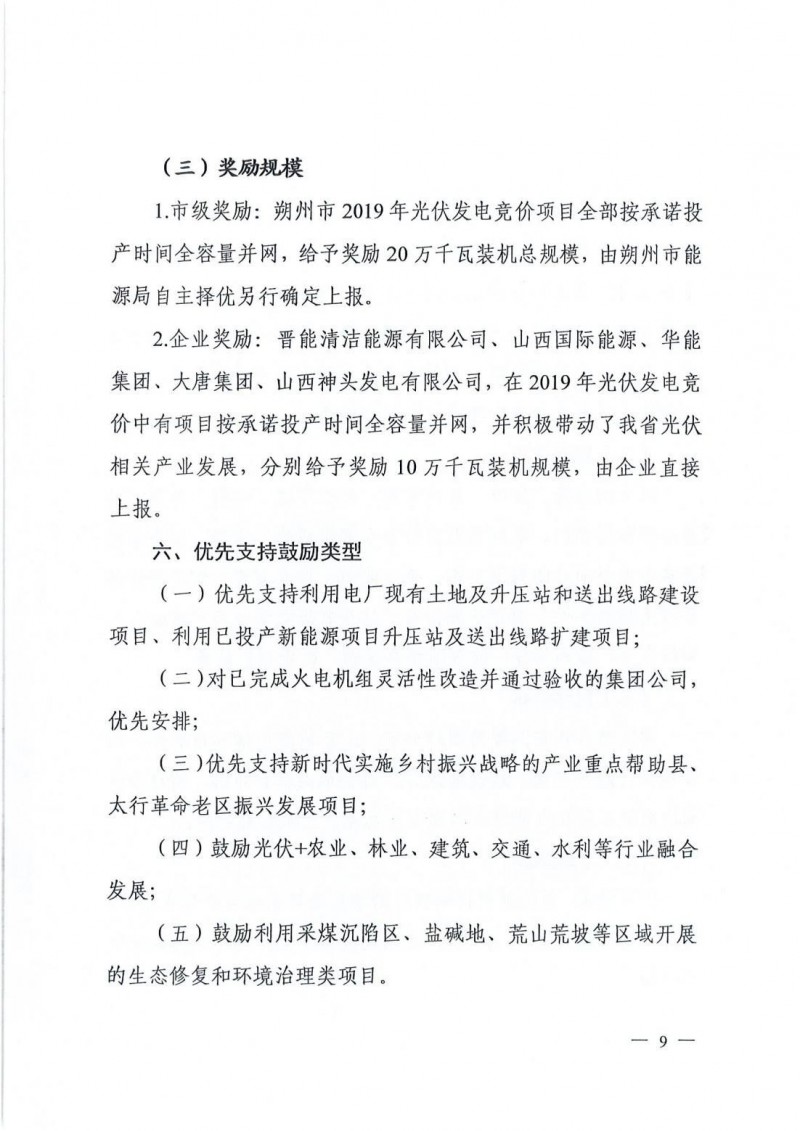 晉能清潔能源有限公司、山西國(guó)際能源、華能集團(tuán)、大唐集團(tuán)、山西神頭發(fā)電有限公司,在2019年光伏發(fā)電競(jìng)價(jià)中有項(xiàng)目按承諾投產(chǎn)時(shí)間全容量并網(wǎng),并積極帶動(dòng)了山西省光伏相關(guān)產(chǎn)業(yè)發(fā)展,分別給予獎(jiǎng)勵(lì)10萬(wàn)千瓦裝機(jī)規(guī)模,由企業(yè)直接上報(bào)。