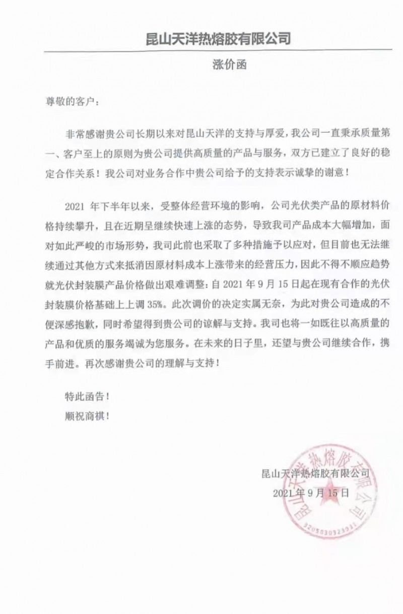 其中,昆山天洋熱熔膠有限公司宣布自9月15日起在現(xiàn)有合作的光伏封裝膜價格基礎(chǔ)上上調(diào)35%;上海海優(yōu)威宣布自9月15日到貨(含當(dāng)日)起在現(xiàn)有合作的膠膜價格上調(diào)漲35%以上。