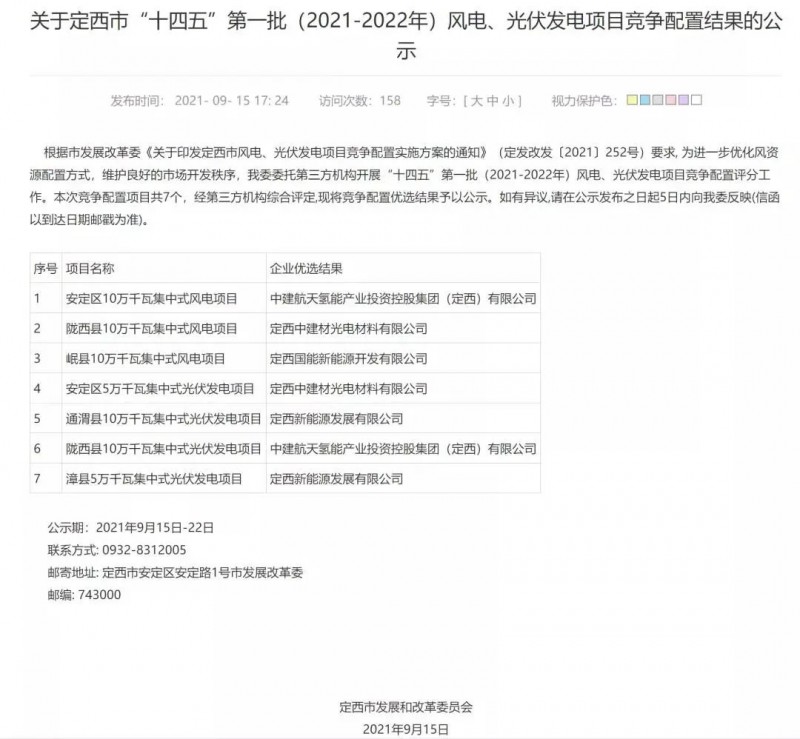 近日,甘肅定西市公布十四五”第一批(2021-2022年)風電、光伏發(fā)電項目競爭配置結果,根據文件,競爭配置風電、光伏發(fā)電項目7個,建設總規(guī)模600MW。其中,風電項目3個、建設規(guī)模300MW,光伏發(fā)電項目4個、建設規(guī)模為300MW。競爭配置風電、光伏發(fā)電項目配置儲能容量不低于風電、光伏發(fā)電項目配置容量的5%,配置風電、光伏發(fā)電項目與儲能設施必須于2022年11月底前全容量建成投產。其中,風電項目必須于2021年12月底前開工建設,光伏發(fā)電項目必須于2021年12月底前實現一半以上并網規(guī)模。