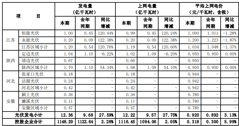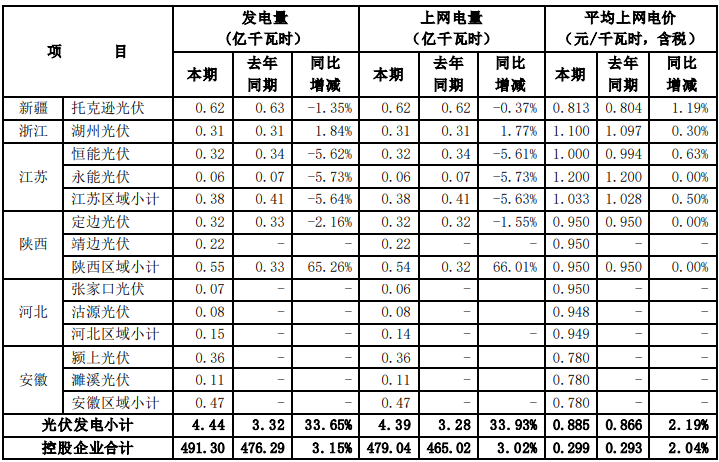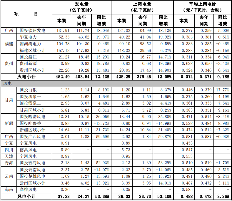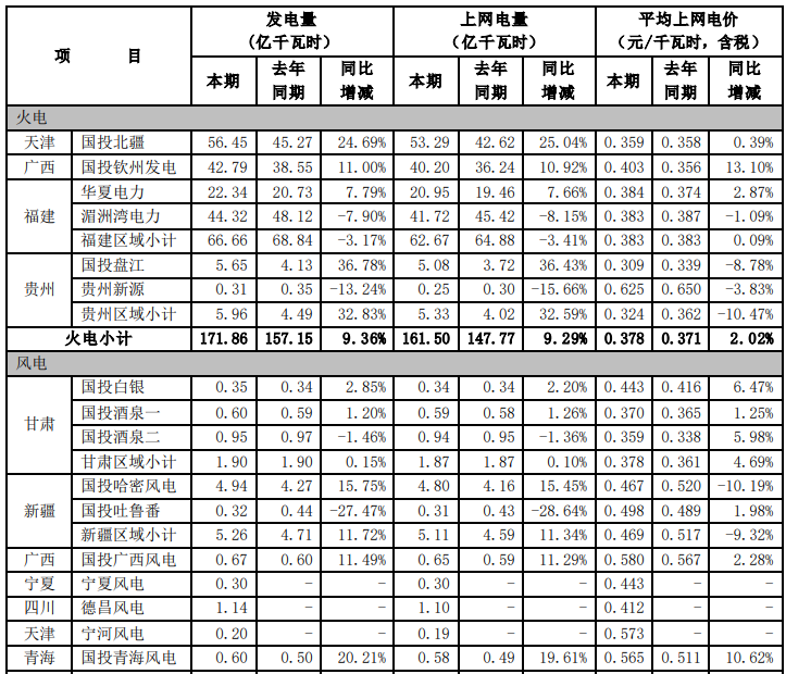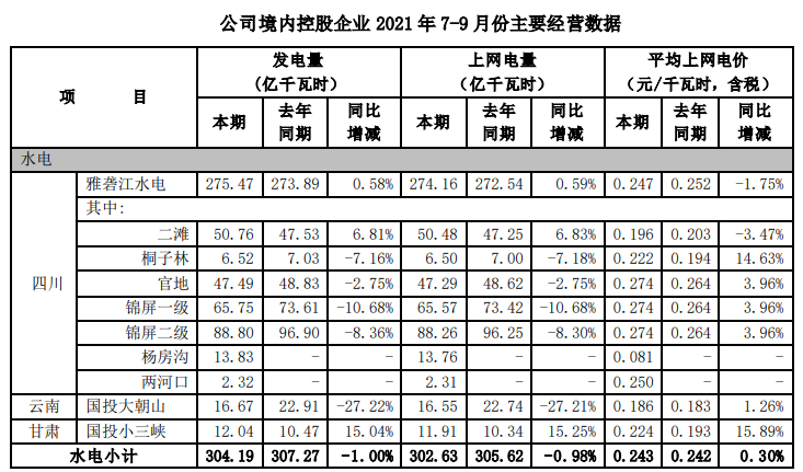根據(jù)國(guó)投電力控股股份有限公司(以下簡(jiǎn)稱(chēng)公司)境內(nèi)控股企業(yè)初步統(tǒng)計(jì), 2021年 7-9 月,公司境內(nèi)控股企業(yè)累計(jì)完成發(fā)電量491.30 億千瓦時(shí),上網(wǎng)電量479.04 億千瓦時(shí),與去年同期相比分別增加3.15%和3.02%。2021年1-9月,公司境內(nèi)控股企業(yè)累計(jì)完成發(fā)電量1148.29億千瓦時(shí),上網(wǎng)電量1116.45億千瓦時(shí), 與去年同期相比分別增加 2.28%和2.05%。 2021年7-9 月,公司境內(nèi)控股企業(yè)平均上網(wǎng)電價(jià)0.299 元/千瓦時(shí),與去年同期相比增加了 2.04%。