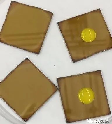 目前來看,鈣鈦礦材料對水汽或高溫較為敏感。直接暴露的高濕環(huán)境下,形成的鈣鈦礦結(jié)構(gòu)將會快速失效,變?yōu)榉氢}鈦礦結(jié)構(gòu),同時(shí)特有的棕褐色也會發(fā)生變化(如下圖,水滴滴在鈣鈦礦材料表面時(shí),顏色發(fā)生了明顯的變化。所以,材料穩(wěn)定性與封裝的研究至關(guān)重要。在2021年初,杭州纖納重磅宣布了全球首個(gè)通過了基于IEC61215標(biāo)準(zhǔn)的加嚴(yán)穩(wěn)定性證書,邁出了鈣鈦礦組件商業(yè)化堅(jiān)實(shí)的一步。