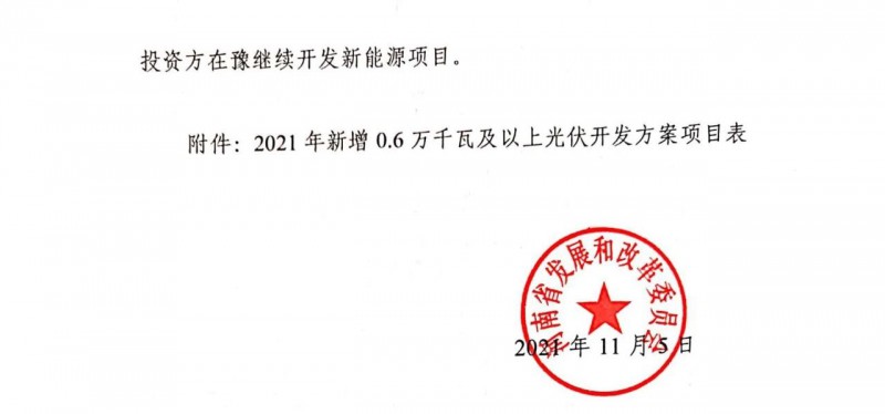 11月5日,河南省發(fā)改委下發(fā)《關(guān)于下達 2021年新增0.6萬千瓦及以上光伏項目開發(fā)方案的通知》。文件指出,對于不新增用地、利用固定建筑物及其附屬場所建設(shè)的光伏項目,不限申報規(guī)模!