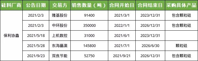 保利協(xié)鑫與下游客戶陸續(xù)簽訂采購長單:保利協(xié)鑫與隆基、中環(huán)、上機、晶澳、雙良等下游客戶簽訂硅料采購長單,總供應(yīng)量68.46萬噸,年均供應(yīng)量22.82萬噸;其中,隆基、中環(huán)、雙良采購產(chǎn)品中明確包含顆粒硅產(chǎn)品,晶澳將于未來5年向協(xié)鑫采購總計14.58萬噸顆粒硅;而上機則將與保利協(xié)鑫共建30萬噸顆粒硅產(chǎn)能。下游客戶長單采購表明了顆粒硅進一步獲得認可。