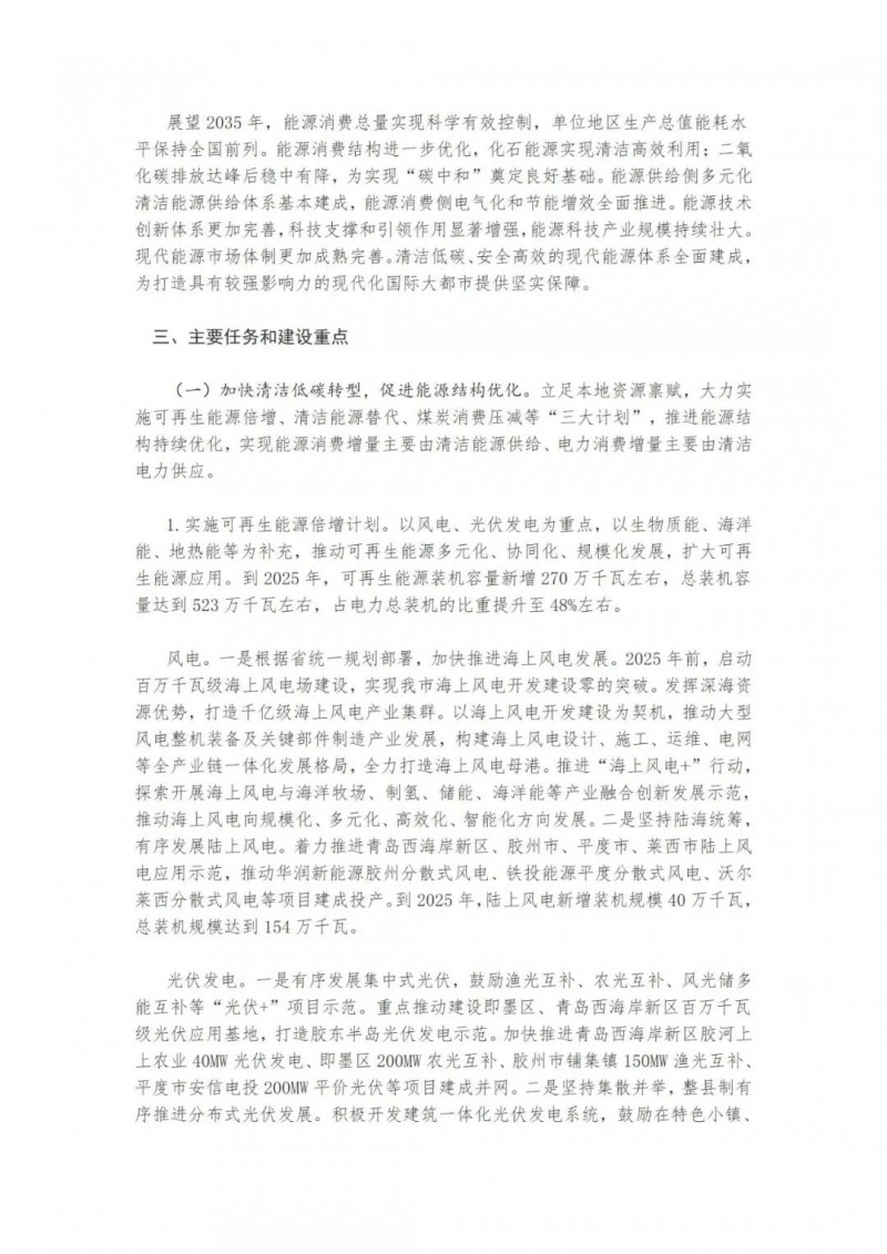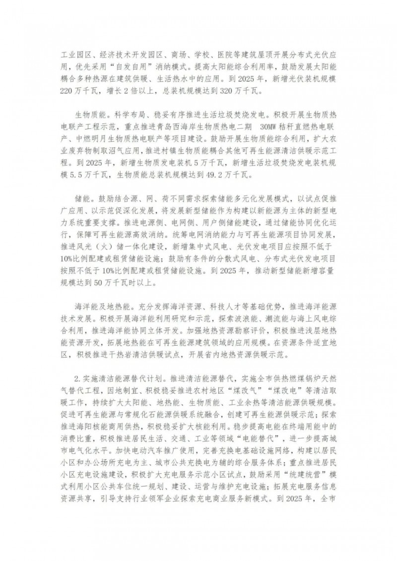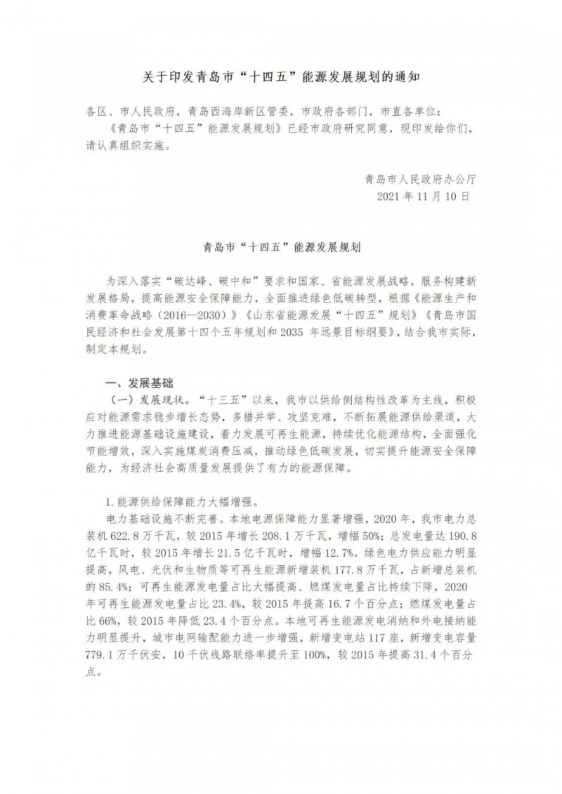 近日,山東青島市人民政府辦公廳印發(fā)了《關(guān)于印發(fā)青島市“十四五”能源發(fā)展規(guī)劃的通知》。提出了青島市“十四五”能源發(fā)展的主要任務(wù)和建設(shè)重點(diǎn)。實(shí)施可再生能源倍增計(jì)劃。以風(fēng)電、光伏發(fā)電為重點(diǎn),以生物質(zhì)能、海洋能、地?zé)崮艿葹檠a(bǔ)充。到2025年,可再生能源裝機(jī)容量新增270萬(wàn)千瓦左右,總裝機(jī)容量達(dá)到523萬(wàn)千瓦左右,占電力總裝機(jī)的比重提升至48%左右。