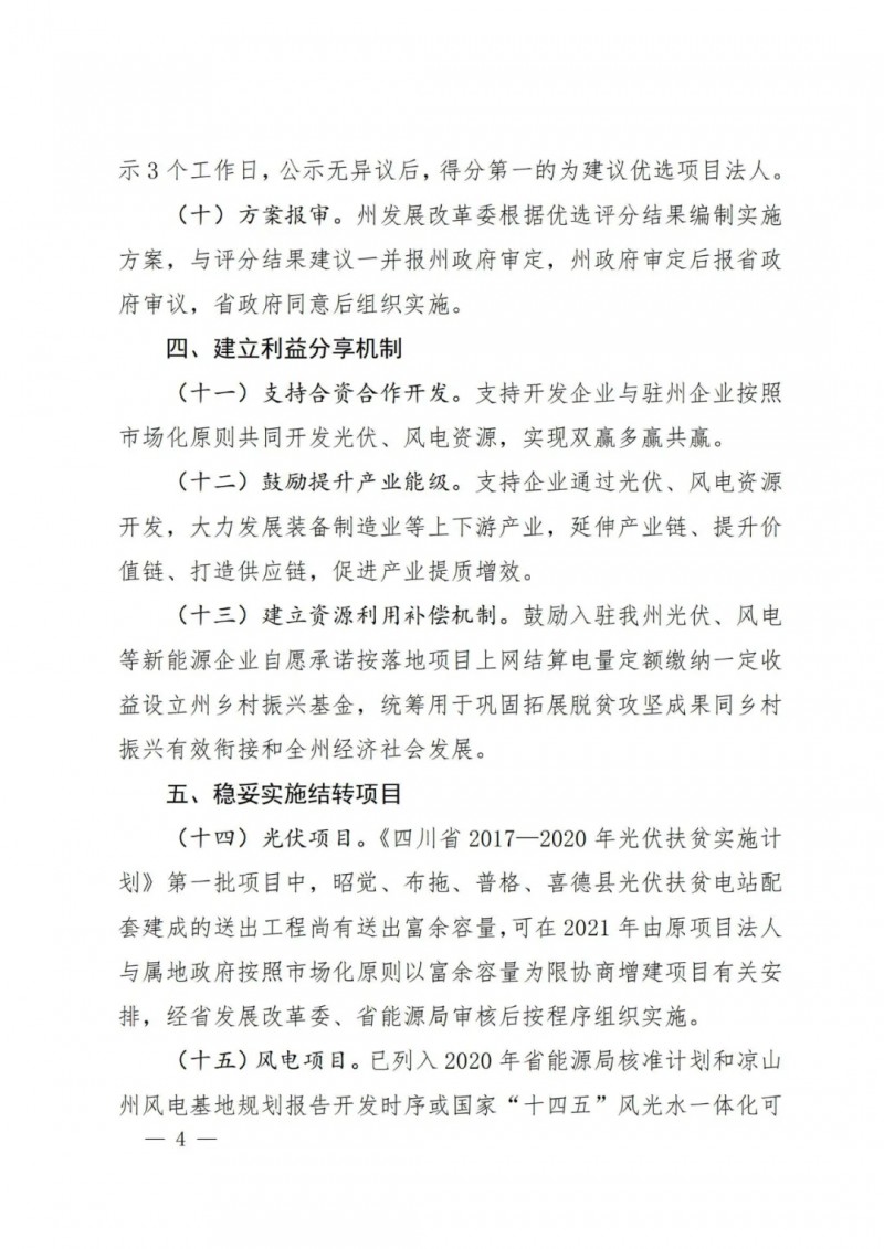 光伏項目?!端拇ㄊ?017—2020 年光伏扶貧實施計 劃》第一批項目中,昭覺、布拖、普格、喜德縣光伏扶貧電站配 套建成的送出工程尚有送出富余容量,可在2021 年由原項目法人 與屬地政府按照市場化原則以富余容量為限協(xié)商增建項目有關安 排,經(jīng)省發(fā)展改革委、省能源局審核后按程序組織實施。