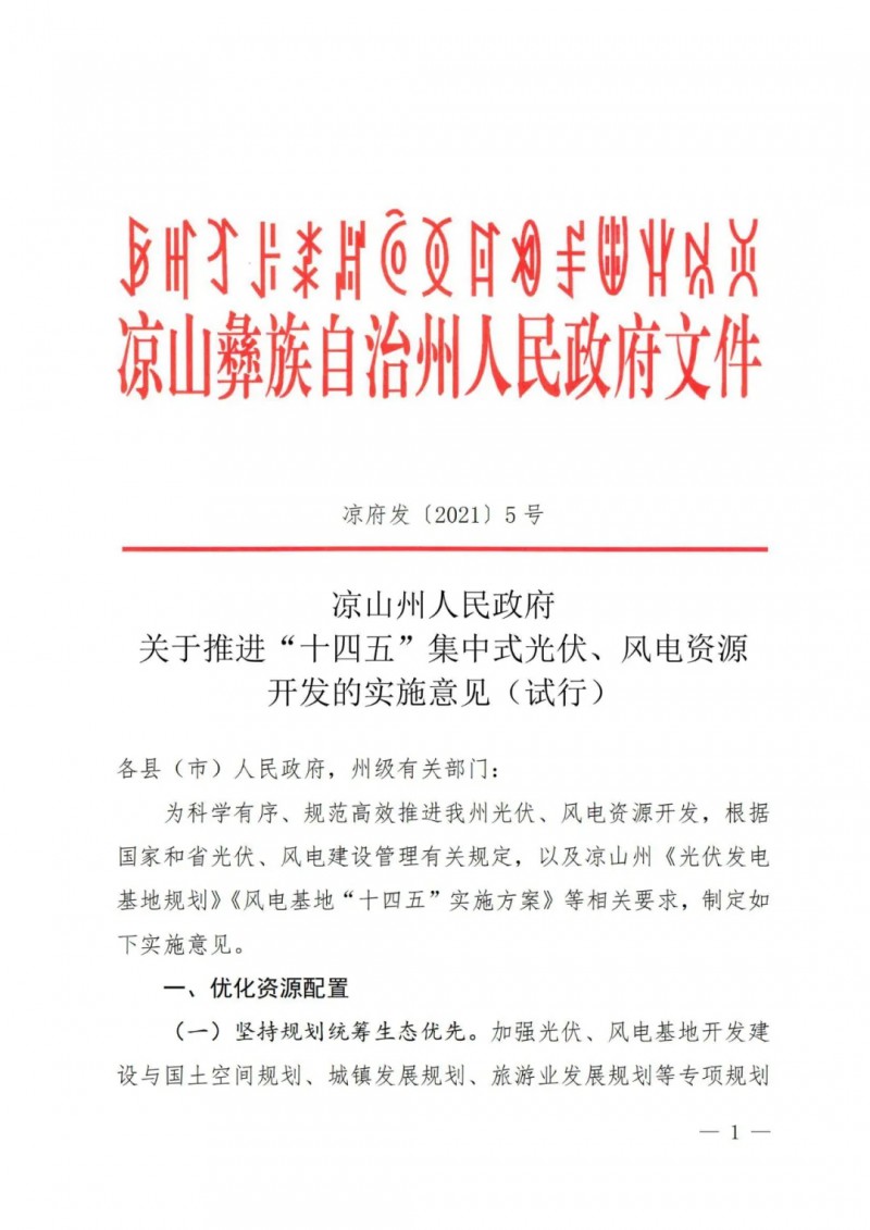 近日,涼山州人民政府發(fā)布《關于推進“十四五”集中式光伏、 風電資源開發(fā)的實施意見(試行)》,意見提出: