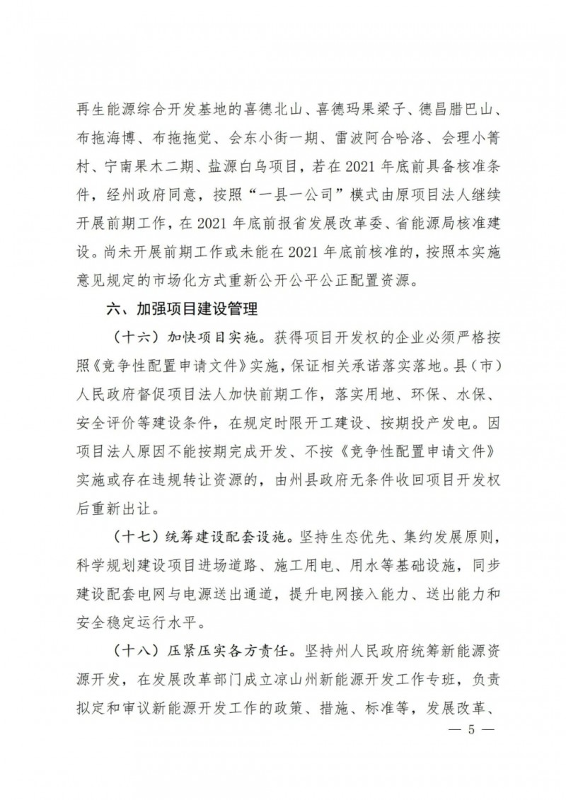 風電項目。已列入2020 年省能源局核準計劃和涼山州風電基地規(guī)劃報告開發(fā)時序或國家“十四五”風光水一體化可再生能源綜合開發(fā)基地的喜德北山、喜德瑪果梁子、德昌臘巴山、布拖海博、布拖拖覺、會東小街一期、雷波阿合哈洛、會理小箐村、寧南果木二期、鹽源白烏項目,若在2021 年底前具備核準條 件,經(jīng)州政府同意,按照“一縣一公司”模式由原項目法人繼續(xù) 開展前期工作,在 2021 年底前報省發(fā)展改革委、省能源局核準建 設。尚未開展前期工作或未能在2021年底前核準的,按照本實施 意見規(guī)定的市場化方式重新公開公平公正配置資源。
