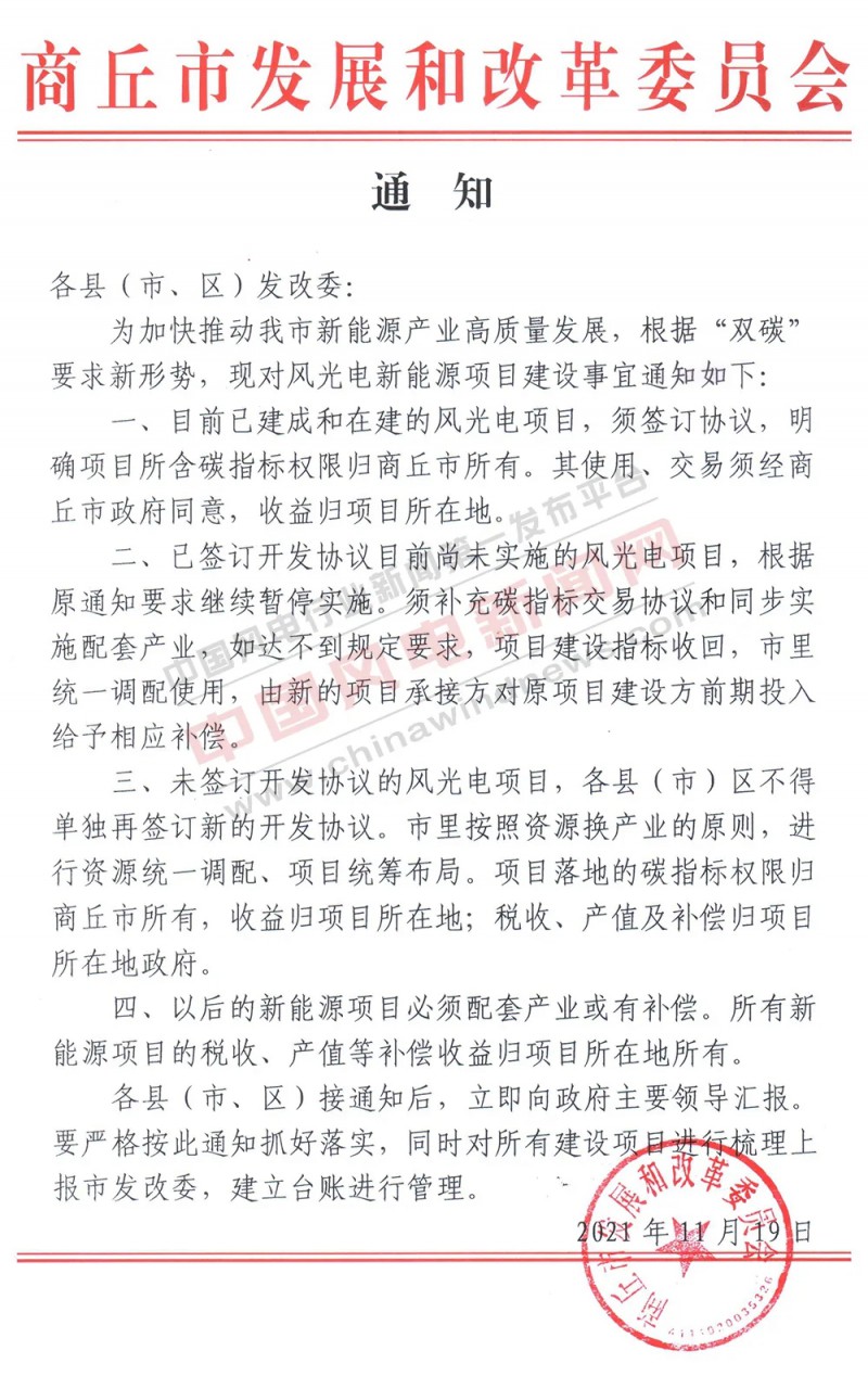 11月19日,河南商丘發(fā)改委發(fā)布了一則關(guān)于風(fēng)光電新能源項(xiàng)目建設(shè)事宜的通知。要求光伏、風(fēng)電項(xiàng)目建設(shè)必須同步配套產(chǎn)業(yè)以及簽訂碳指標(biāo)協(xié)議。沒有達(dá)到要求的未施工項(xiàng)目,繼續(xù)暫停實(shí)施;達(dá)不到規(guī)定要求的企業(yè),項(xiàng)目建設(shè)指標(biāo)收回。