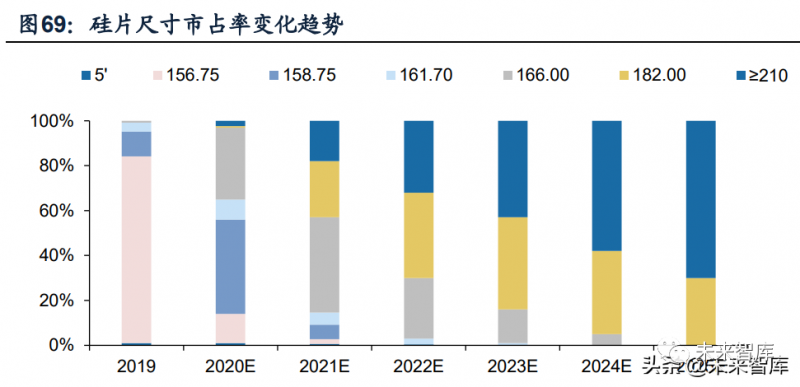 (1)背景:大尺寸化推動(dòng)多環(huán)節(jié)降本,滲透提升成必然趨勢(shì)。在制造端,大尺寸硅片可以提升硅片、電池和組件產(chǎn)出量,從而攤薄單位生產(chǎn)成本;在組件端, 大尺寸硅片能夠有效提升組件功率,通過優(yōu)化電池和組件的設(shè)計(jì)提高組件效率,降低單瓦成本;在系統(tǒng)端,單片組件功率和轉(zhuǎn)換效率的提升可以減少支架及匯流箱等 固定成本。因此,大尺寸化能夠有效攤薄各環(huán)節(jié)加工及BOS成本,推動(dòng)度電成本下降,大尺寸趨勢(shì)確定。據(jù)PV-Infolink預(yù)測(cè),2020年硅片市場(chǎng)仍以158/166mm為 主,市占率為74%,但2021年時(shí)182/210mm尺寸硅片市占率將擴(kuò)大至18%,此后逐年上升。