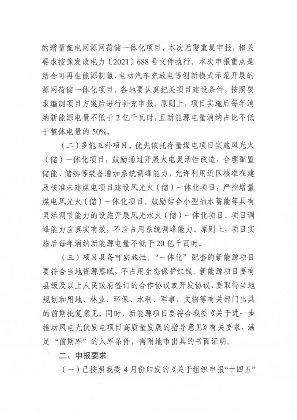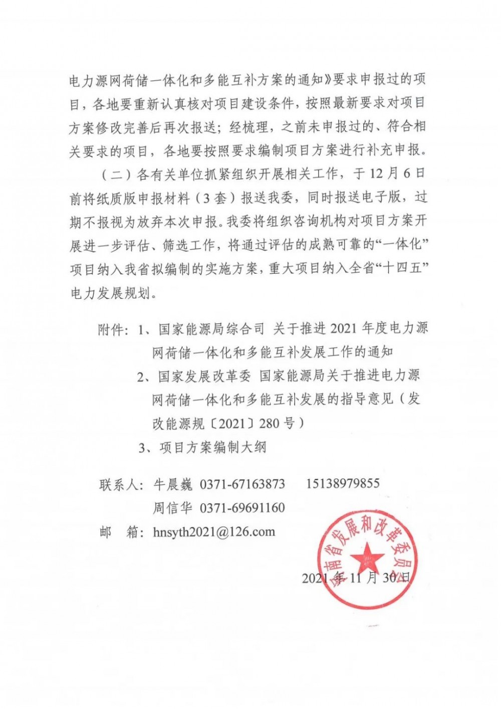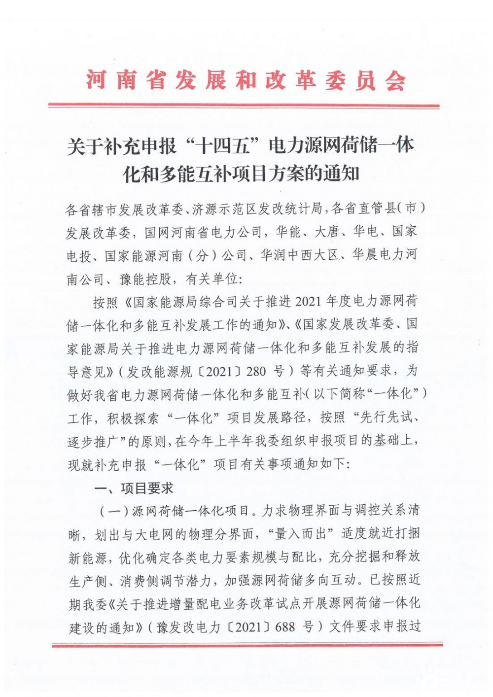 11月30日,河南省發(fā)改委發(fā)布了《關(guān)于補(bǔ)充申報(bào)“十四五”電力源網(wǎng)荷儲(chǔ)一體化和多能互補(bǔ)項(xiàng)目方案》的通知。按照“先行先試、逐步推廣”的原則,在今年上半年河南發(fā)改委組織申報(bào)項(xiàng)目的基礎(chǔ)上,再次補(bǔ)充申報(bào)“一體化”項(xiàng)目。