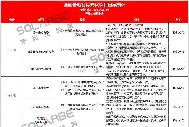 全國各地暫停光伏項目備案統(tǒng)計(全年統(tǒng)計)