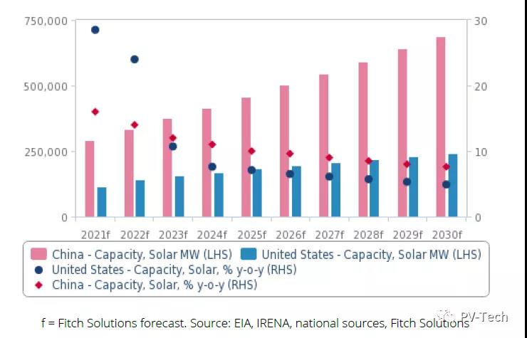 Fitch報(bào)告預(yù)測(cè)稱,中國的太陽能裝機(jī)容量將從2020年年底的253.4GW增至2030年的690.3GW。在提交給聯(lián)合國的最新國家自主貢獻(xiàn)報(bào)告中,中國的目標(biāo)是2030年實(shí)現(xiàn)1.2TW可再生能源容量。