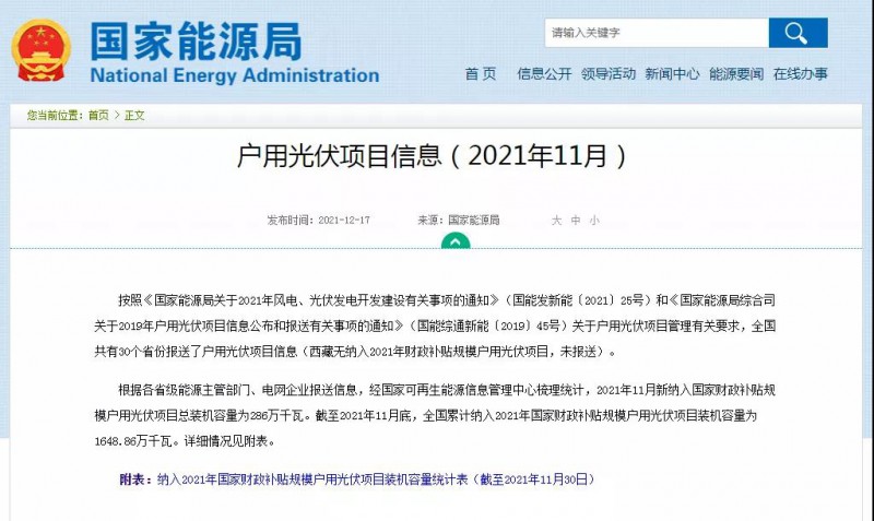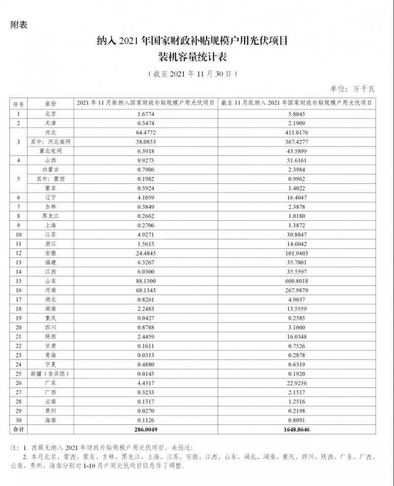 根據(jù)各省級能源主管部門、電網(wǎng)企業(yè)報送信息,經(jīng)國家可再生能源信息管理中心梳理統(tǒng)計,2021年11月新納入國家財政補貼規(guī)模戶用光伏項目總裝機(jī)容量為286萬千瓦。截至2021年11月底,全國累計納入2021年國家財政補貼規(guī)模戶用光伏項目裝機(jī)容量為1648.86萬千瓦。詳細(xì)情況見附表。