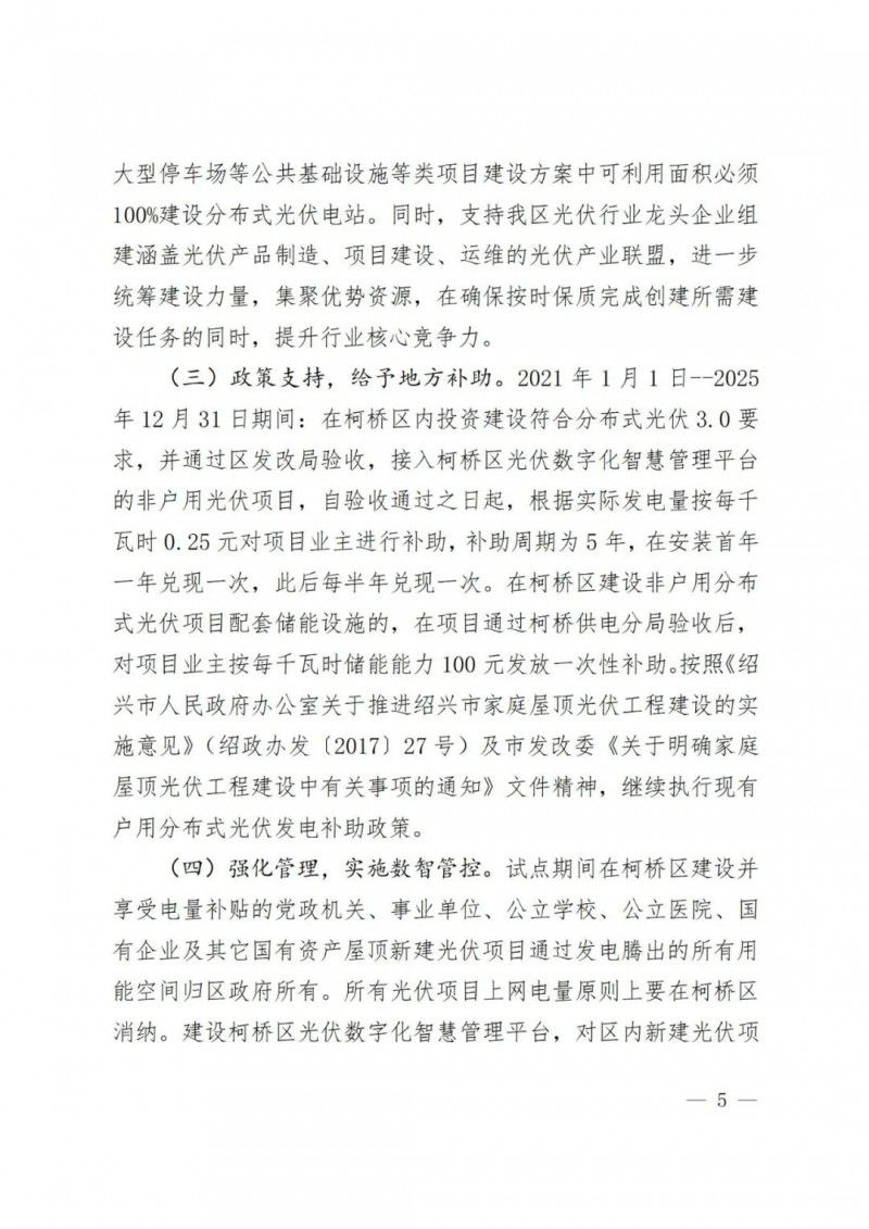 政策方面給予一定的地方補(bǔ)助,2021年1月1日--2025年12月31日期間:在柯橋區(qū)內(nèi)投資建設(shè)符合分布式光伏3.0要求,根據(jù)實(shí)際發(fā)電量按每千瓦時(shí)0.25元對(duì)項(xiàng)目業(yè)主進(jìn)行補(bǔ)助,補(bǔ)助周期為5年,在安裝首年一年兌現(xiàn)一次,此后每半年兌現(xiàn)一次。在柯橋區(qū)建設(shè)非戶用分布式光伏項(xiàng)目配套儲(chǔ)能設(shè)施的,在項(xiàng)目通過(guò)柯橋供電分局驗(yàn)收后,對(duì)項(xiàng)目業(yè)主按每千瓦時(shí)儲(chǔ)能能力100元發(fā)放一次性補(bǔ)助。