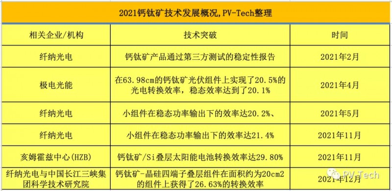 2021年各企業(yè)及研究機(jī)構(gòu)鈣鈦礦技術(shù)突破匯總,PV-Tech整理