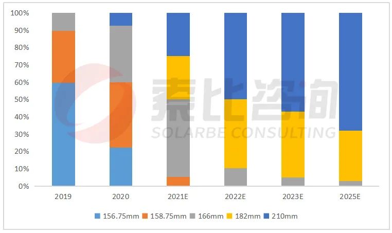 尺寸方面,2021年166mm硅片與大尺寸硅片(182和210)為市場主流,2022年大尺寸硅片將成為市場主流,市占率提升。薄片化也將成為發(fā)展趨勢,目前市場主流硅片厚度160μm。