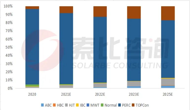 當(dāng)前,PERC電池仍為主流市場,2021年P(guān)ERC市占率85%以上,隨著PERC效率已至頂點,N型技術(shù)逐步發(fā)展,目前PERC產(chǎn)能預(yù)留改造TOPCON產(chǎn)線,未來擴(kuò)產(chǎn)產(chǎn)能以N型技術(shù)為主,N型技術(shù)市占率逐步提升。