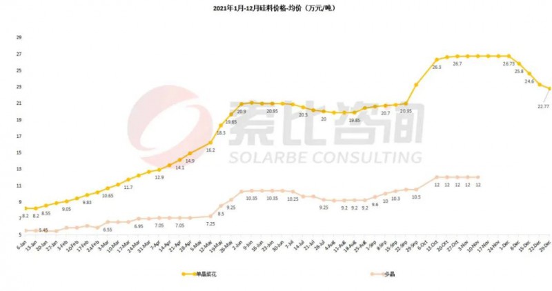近兩年供應(yīng)短缺預(yù)期明確之后,硅片企業(yè)為了保證供應(yīng),紛紛與硅料廠家簽訂長單。據(jù)統(tǒng)計,2020-2021年超215萬噸硅料長單被簽訂,約占我國2~3年的供應(yīng)量。2021年年底硅料價格較年初漲幅達(dá)177.2%,最高達(dá)270元/KG,12月受硅料價格下調(diào)及新產(chǎn)能釋放影響,價格下調(diào)。