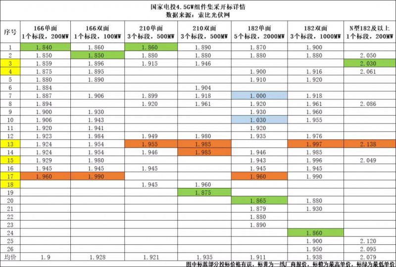 其中166單玻450Wp及以上采購容量200MW,共有17家組件廠商參與投標(biāo),投標(biāo)價在1.84~1.96元/W,均價1.9元/W。