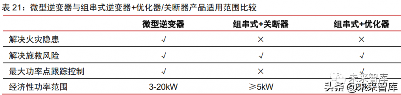微型逆變器是小型、組件級(jí)分布式發(fā)電系統(tǒng)電能轉(zhuǎn)換的最佳方案。“組件級(jí)電力電子” 解決方案除了包括微型逆變器,還有“組串式逆變器+優(yōu)化器/關(guān)斷器”的方案。優(yōu)化器或 關(guān)斷器可為光伏系統(tǒng)提供組件級(jí)的關(guān)斷能力,在特定場(chǎng)景下保證光伏系統(tǒng)直流電壓不超過(guò) 80V,且優(yōu)化器亦可實(shí)現(xiàn)組件級(jí)的最大功率點(diǎn)跟蹤控制;但在運(yùn)行過(guò)程中系統(tǒng)仍存在直流 高壓,有一定的安全隱患。組串式逆變器+優(yōu)化器/關(guān)斷器在較大功率的應(yīng)用場(chǎng)景中有一定 的成本優(yōu)勢(shì),但微型逆變器在中小功率等級(jí)的應(yīng)用場(chǎng)景中更優(yōu)。