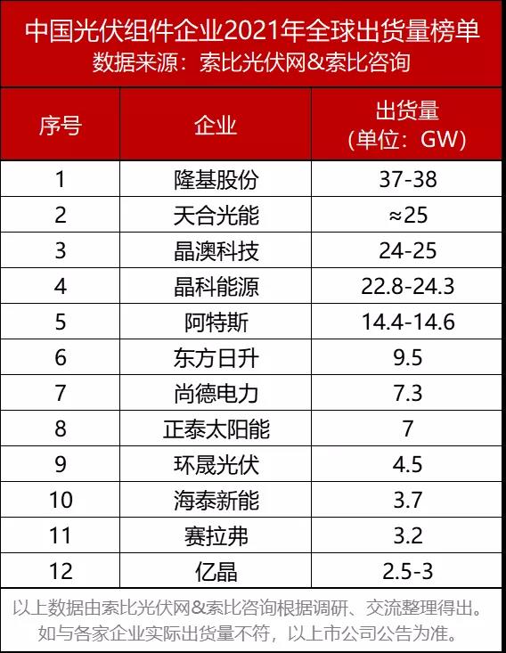 從索比光伏網(wǎng)&索比咨詢發(fā)布的《中國(guó)光伏組件企業(yè)2021年全球出貨量榜單》看,隆基股份、天合光能、晶澳科技、晶科能源、阿特斯、東方日升、尚德電力、正泰太陽(yáng)能、環(huán)晟光伏、海泰新能、賽拉弗、億晶光電等企業(yè)名列前茅,出貨量合計(jì)約140GW,占全球組件總需求的75%以上。無(wú)論在國(guó)內(nèi)還是海外市場(chǎng),他們都斬獲頗豐。